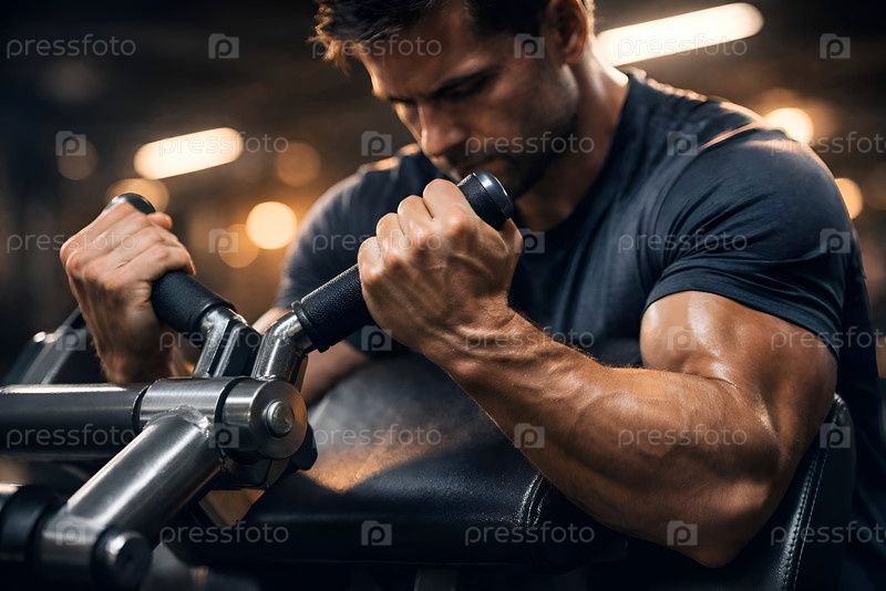 Крупный план мускулистых рук, выполняющих сгибания на скамье Скотта в тренажерном зале — интенсивная силовая тренировка бицепса и предплечий, акцент на технике и рельефе мышц