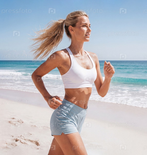 Женщина бегает по песчаному пляжу в белом спортивном топе и светлых шортах на фоне океана в солнечный день — утренняя пробежка и отдых у моря, концепция здорового и активного образа жизни