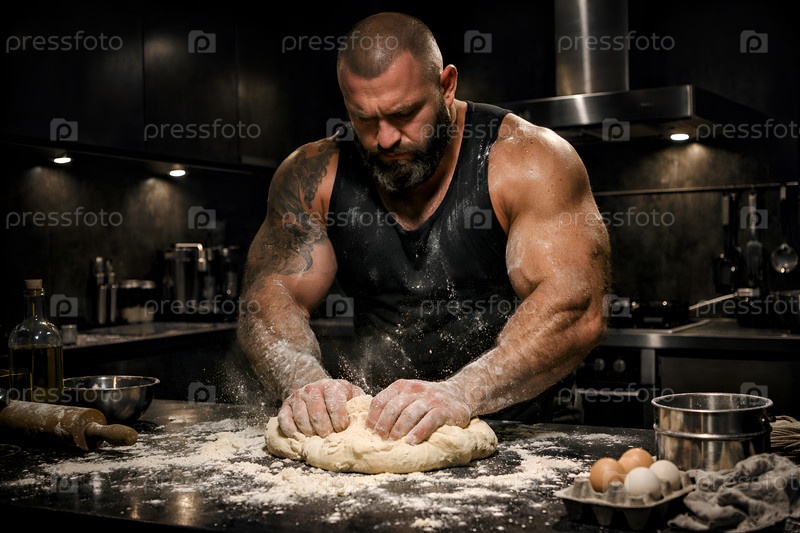 Мускулистый мужчина в майке замешивает тесто на рабочем столе в темной индустриальной кухне, драматичное освещение, мука в воздухе и на руках, акцент на мощных руках и процессе приготовления домашнего хлеба