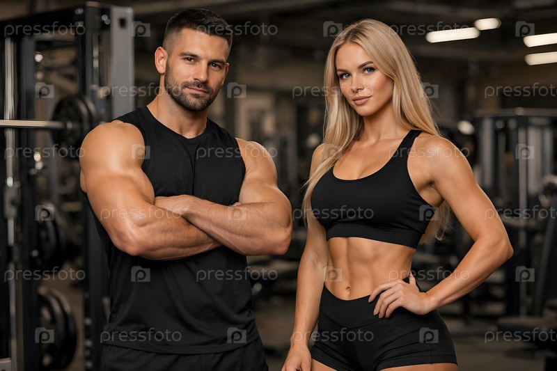 Спортивная пара в тренажерном зале: мужчина и женщина‑фитнес‑тренеры в черной спортивной одежде демонстрируют рельефную мускулатуру на фоне тренажеров