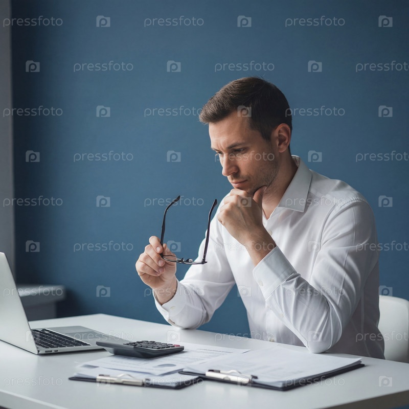 Задумчивый молодой мужчина в белой рубашке за рабочим столом с ноутбуком, калькулятором и документами — деловое планирование, финансовый анализ и подготовка отчетов в офисе