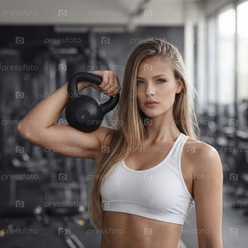 Молодая женщина в белом спортивном топе выполняет упражнение с гирей в современном тренажерном зале — силовая и функциональная тренировка для плеч, рук и корпуса
