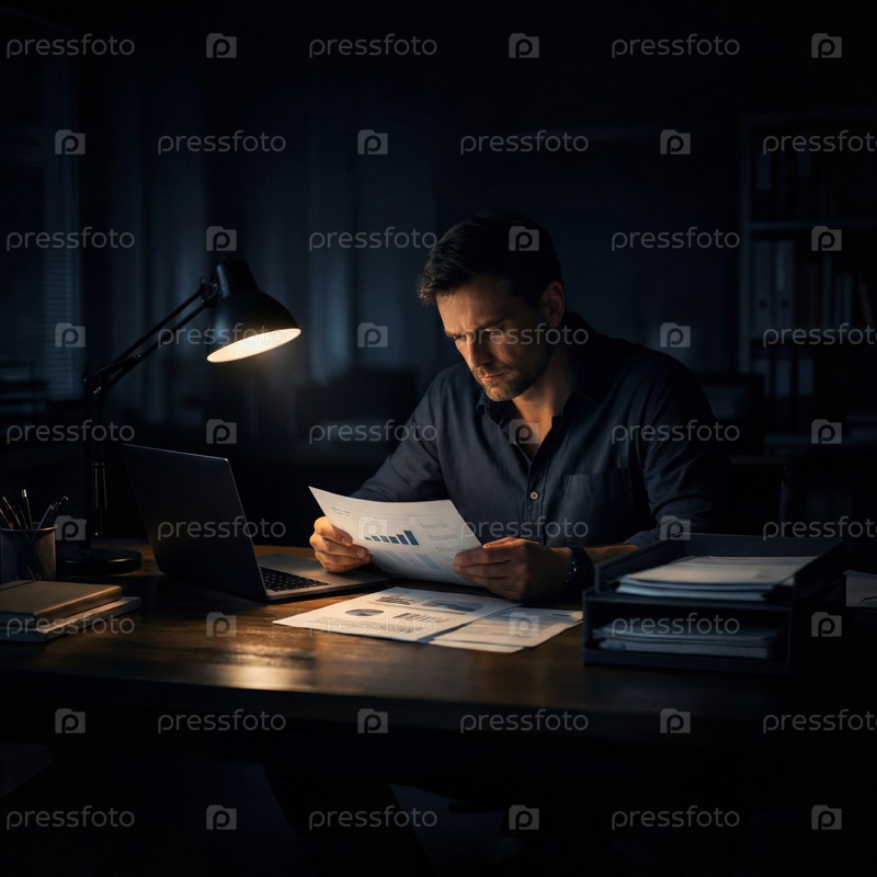 Мужчина допоздна изучает финансовые отчеты и графики при настольной лампе в офисе — работа с документами и ноутбуком в поздний вечер