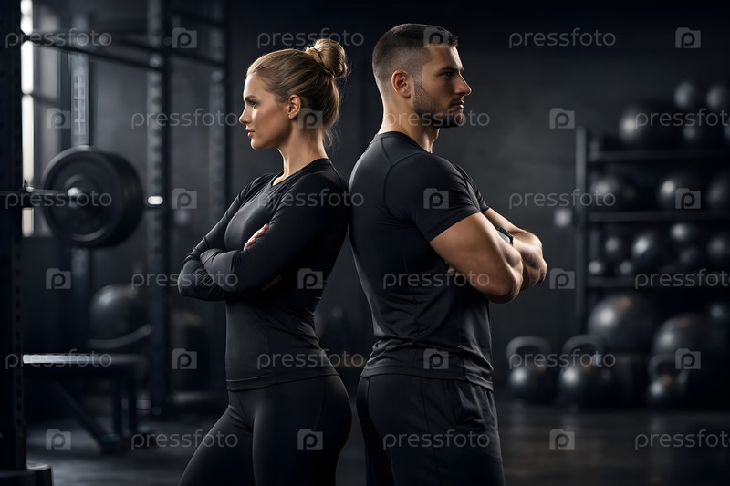 Спортивная пара в черной тренировочной одежде стоит спиной друг к другу в современном тренажерном зале — командная мотивация, силовая подготовка и уверенность