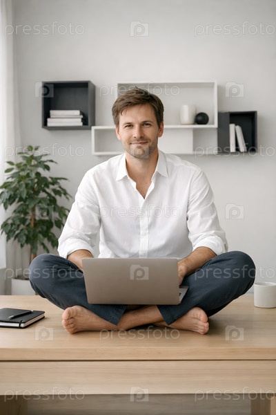 Удаленный сотрудник в повседневной белой рубашке сидит по-турецки на деревянном столе с ноутбуком в светлом минималистичном домашнем офисе