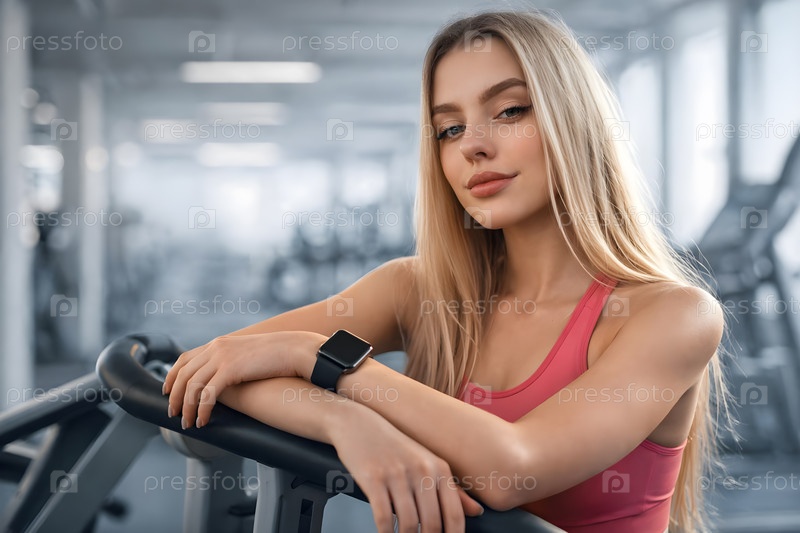 Портрет молодой женщины в спортзале: опирающаяся на кардиотренажер в розовом спортивном топе с умными часами