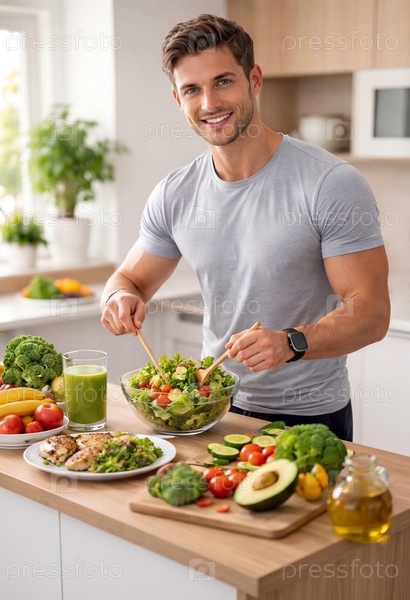 Активный молодой человек готовит здоровый салат на современной кухне с авокадо, помидорами черри, брокколи, зеленью, зеленым смузи и куриной грудкой — концепция правильного питания, фитнес-питания и сбалансированного образа жизни