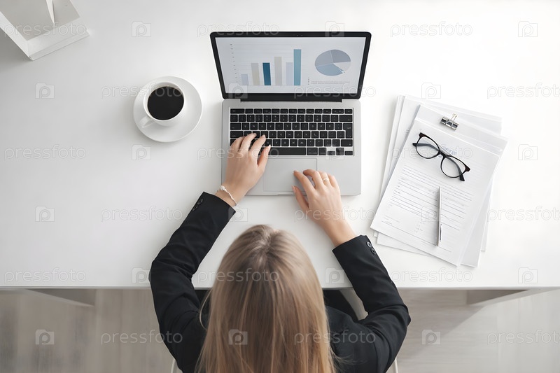 Деловая женщина за ноутбуком с финансовыми графиками — вид сверху на офисный стол с документами, очками, ручкой и чашкой кофе