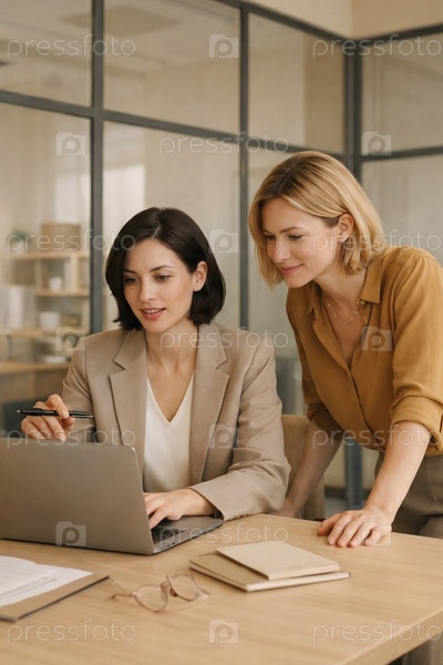 Две сотрудницы обсуждают проект за ноутбуком: совместная работа и наставничество в современном офисе с стеклянными перегородками, блокнотами и документами на столе