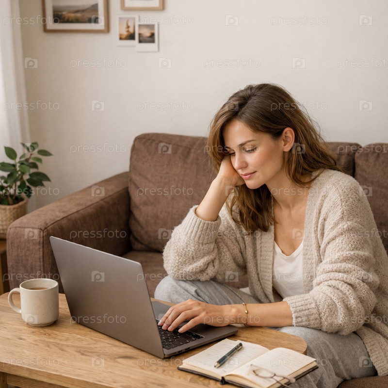 Молодая женщина работает из дома за ноутбуком, сидя на диване в уютной гостиной с кружкой кофе и открытым блокнотом для заметок