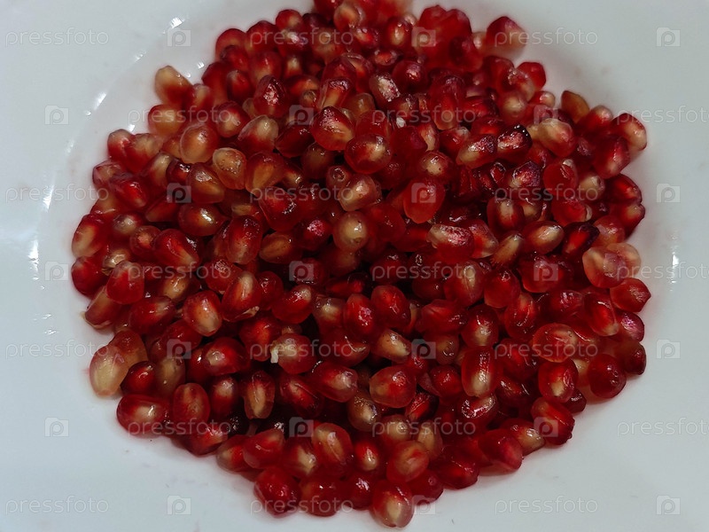 Фрукт или муфта, красная красная граната, белая тарелка. Плод представляет собой спелый красный гранат, разбитый на фракции на белой пластине