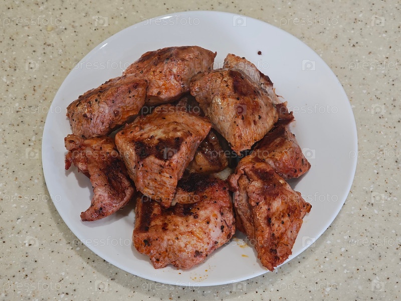 На белой тарелке мясо, приготовленное на электрическом гриле в помещении на кухне. On a white plate is meat cooked on an electric grill indoors in the kitchen