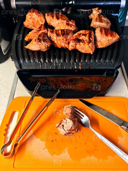 Куски выглядит как электрический гриль. Куски мяса на электрической гриле
