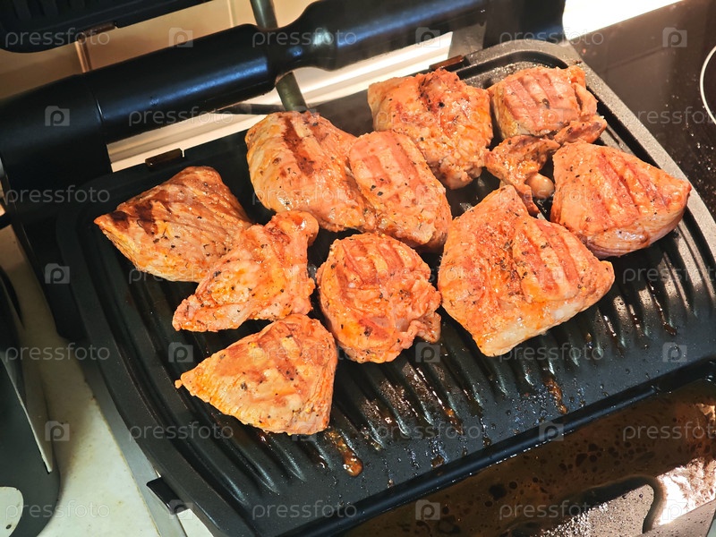 Куски выглядит как электрический гриль. Куски мяса на электрической гриле