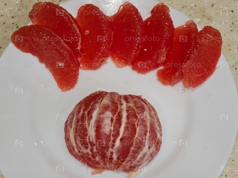 Красный грейпфрут на белой тарелке. Red grapefruit on a white plate