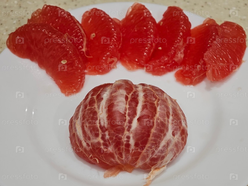 Красный грейпфрут на белой тарелке. Red grapefruit on a white plate