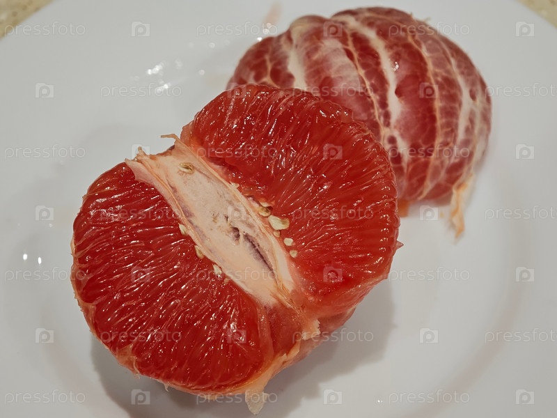 Красный грейпфрут на белой тарелке. Red grapefruit on a white plate