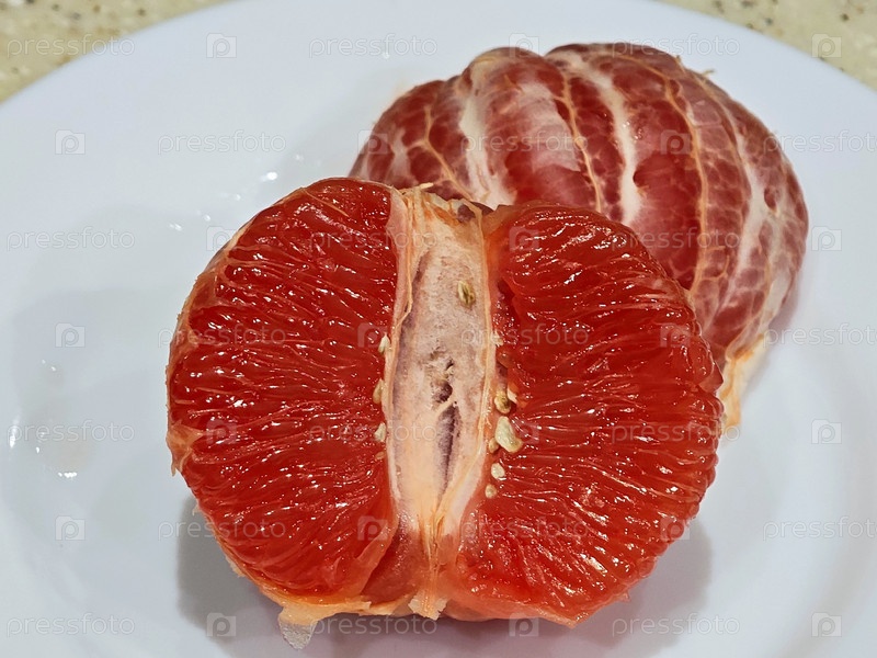 Красный грейпфрут на белой тарелке. Red grapefruit on a white plate