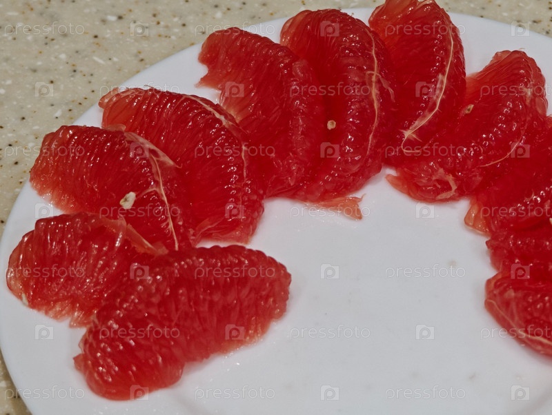 Красный грейпфрут, почищенные дольки и косточки на белой тарелке. Red grapefruit, peeled slices on a white plate