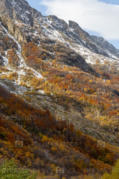 Вид на скалистый, крутой горный склон, покрытый снегом и красочным лесом в Ущелье Домбай-Ульген, заповеднике Теберда, Северный Кавказ. Красивый осенний пейзаж. Путешествие и поход на дикую природу