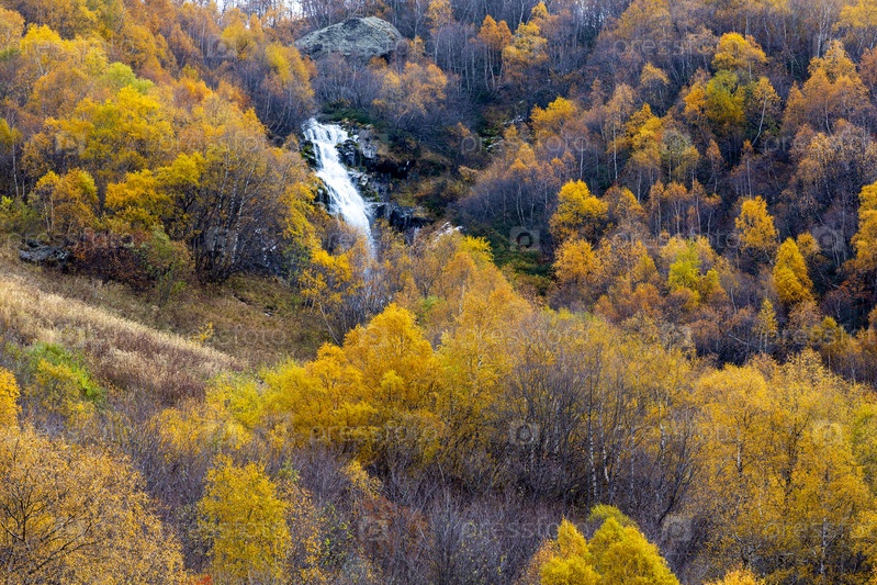 Вид на водопад, стекающий по красочному лесистому склону в Ущелье Домбай-Ульген, заповеднике Теберда, горах Северного Кавказа. Красивый природный осенний пейзаж. Путешествие и поход в пустыню