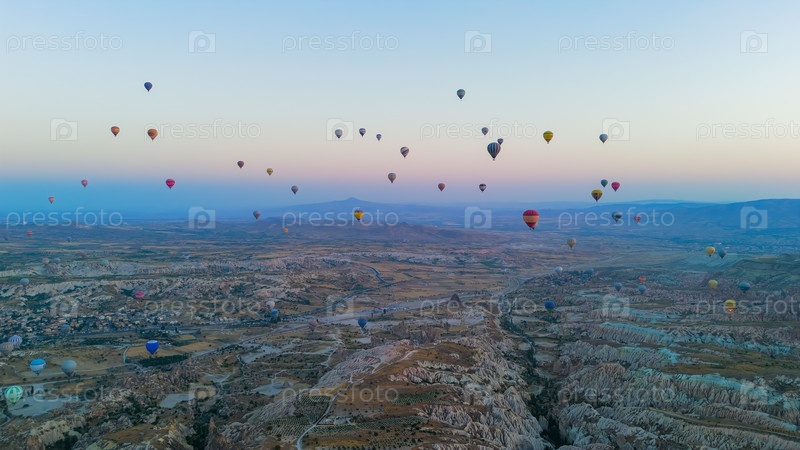 Гореме, Невшехир, Турция. Эпический пейзаж Каппадокийской Красной долины с армадой на воздушном шаре, стреляющей горелками под драматическим утренним небом. Вид с воздуха