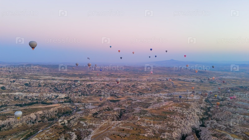 Гореме, Невшехир, Турция. Массивная армада воздушных шаров с огнем, летящих на рассвете над городом Гореме и пейзажем Каппадокии с панорамным видом. Вид с воздуха