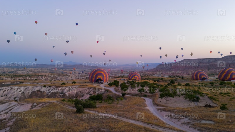 Гореме, Невшехир, Турция. Предрассветный мягкий рассвет с воздушными шарами в небе и красочными клетчатыми воздушными шарами, раздувающимися на земле в пейзаже Каппадокии. Вид с воздуха