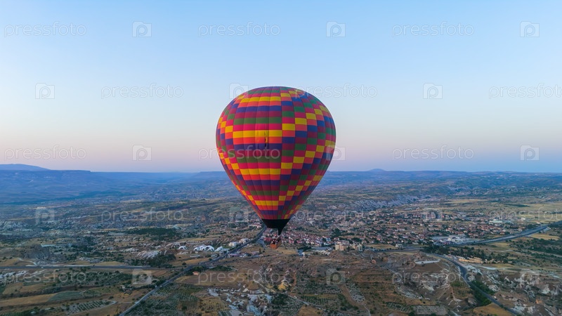 Гореме, Невшехир, Турция. Большой красочный клетчатый воздушный шар с большой корзиной и огненными всплесками, пролетающими над плато с голубым горизонтом дымки на рассвете. Вид с воздуха