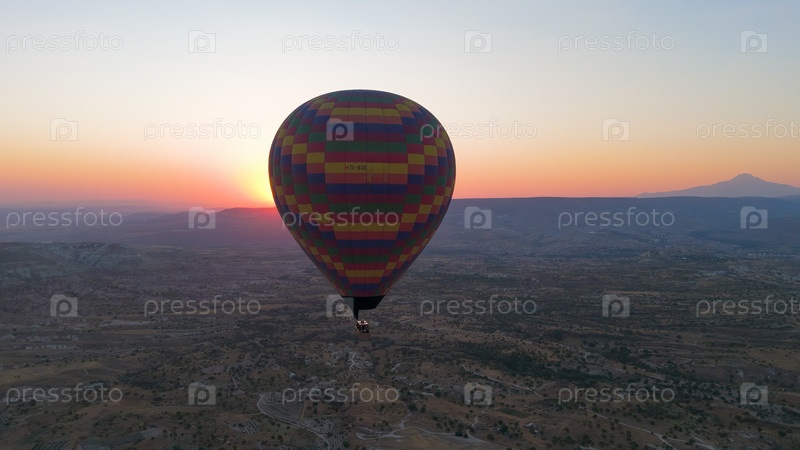 Гореме, Невшехир, Турция. Красочный клетчатый воздушный шар с корзиной в теплом утреннем солнечном свете сразу после восхода солнца над плато Каппадокия. Вид с воздуха