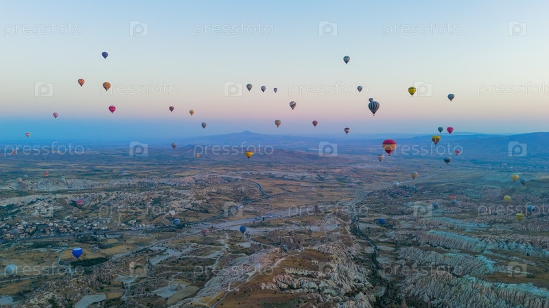 Гореме, Невшехир, Турция. Эпический пейзаж Каппадокийской Красной долины с армадой на воздушном шаре, стреляющей горелками под драматическим утренним небом. Вид с воздуха