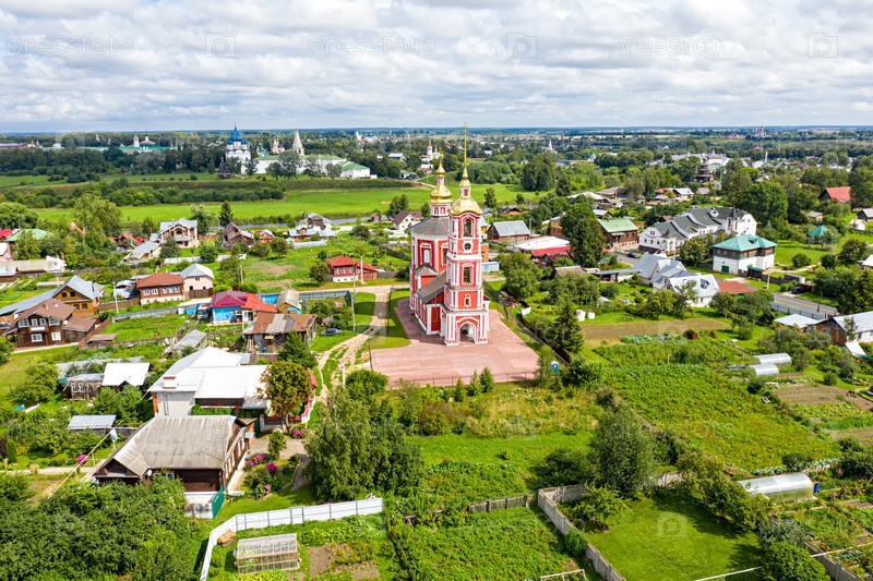 Суздаль, Россия. Полет. Церковь святых благородных князей Бориса и Глеба на Борисовской стороне или Борисоглебская церковь. Вид с воздуха