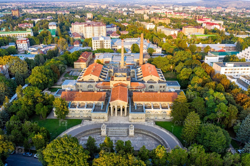 Эссентуки, Россия. Есентуки бальнео-грязевые ванны. Самый известный архитектурный памятник курортного города. Вид с воздуха