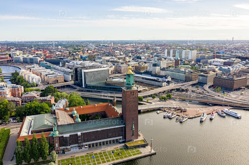 Стокгольм, Швеция. Город Стокгольм Холл выходит на центр города. Построенная в 1923 году, ратуша из красного кирпича. аэрофотосъемка