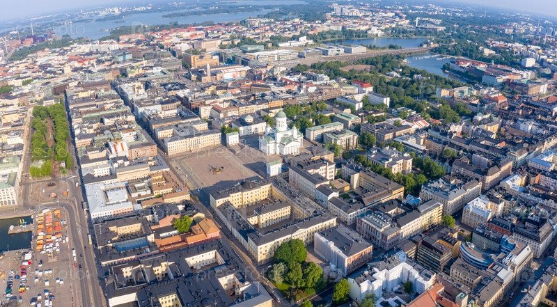 Хельсинки, Финляндия. Вид с воздуха на центр города. Хельсинкский собор. Сенатская площадь. Рыночная площадь, Дрон