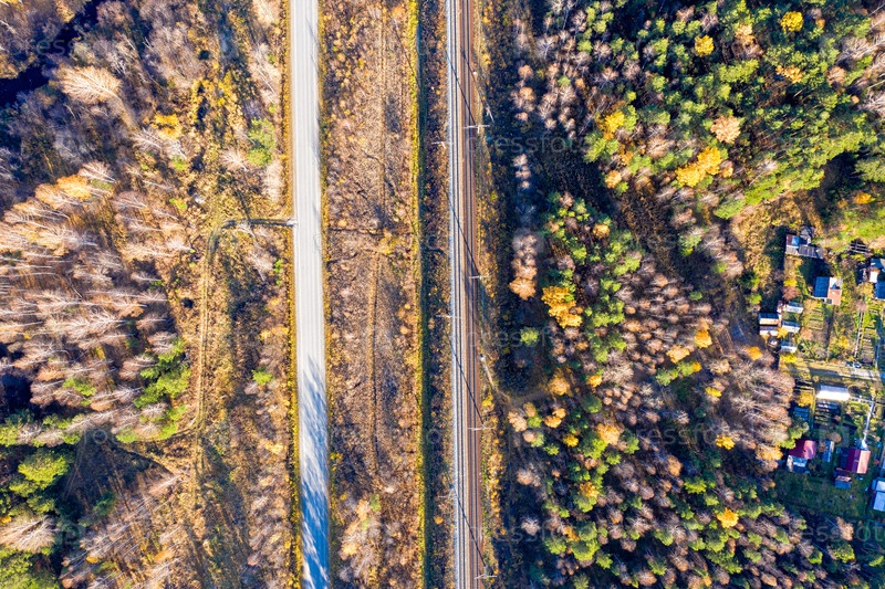 Дорога проходит параллельно железной дороге. Деревни отдыха. Пролетая над осенним смешанным лесом во время заката. Урал, Россия. Вид сверху. Стреляли сверху