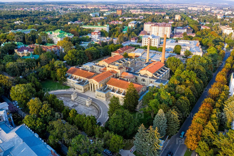 Эссентуки, Россия. Есентуки бальнео-грязевые ванны. Самый известный архитектурный памятник курортного города. Вид с воздуха