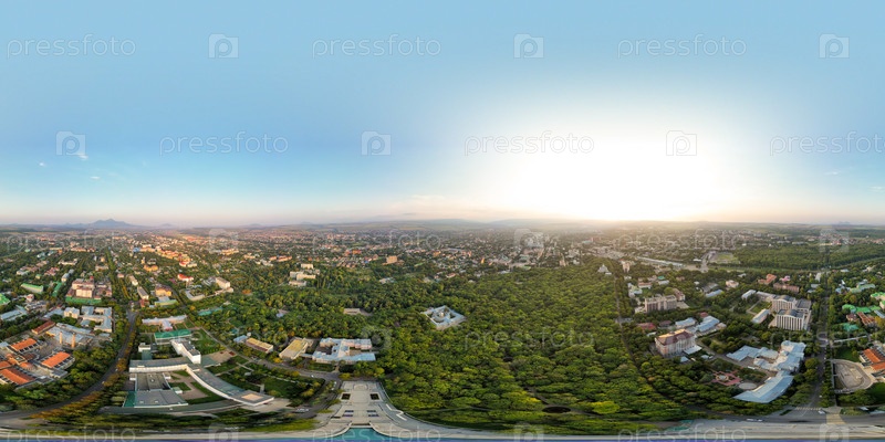 Эссентуки, Россия. Панорама города и курортный парк. Парк культуры и отдыха. Время заката. Вид с воздуха. Панорама 360