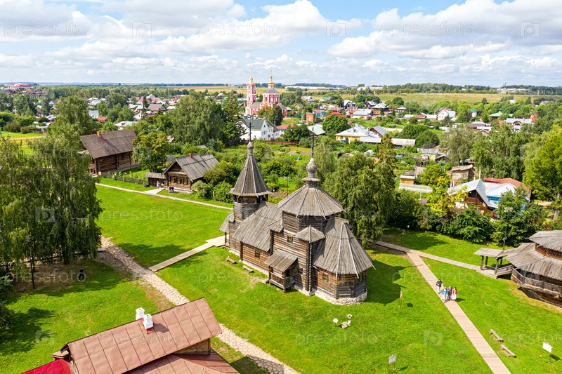 Суздаль, Россия. Церковь Преображения из села Козлятево, перевезенная в Суздаль - памятник деревянной архитектуры середины 18 века. Вид с воздуха