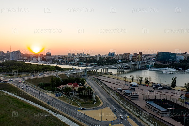 Ростов-на-Дону, Россия. Ворошиловский мост. Дон Ривер. Летняя панорама города с воздуха, вид с воздуха. Закат