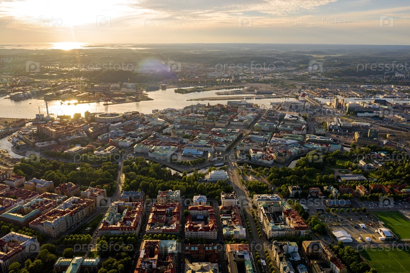 Гетеборг, Швеция. Панорамный вид с воздуха на центр города вечером. Закат