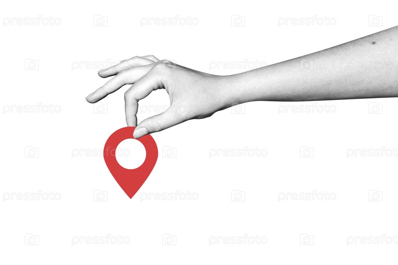 Рука коллажа держит метку местоположения. GPS навигация. Положение на карте. Местонахождение. Маршрут. Путь. Маршрут доставки. Маршрут такси. Логистика. Отметка. Геолокация. Направление