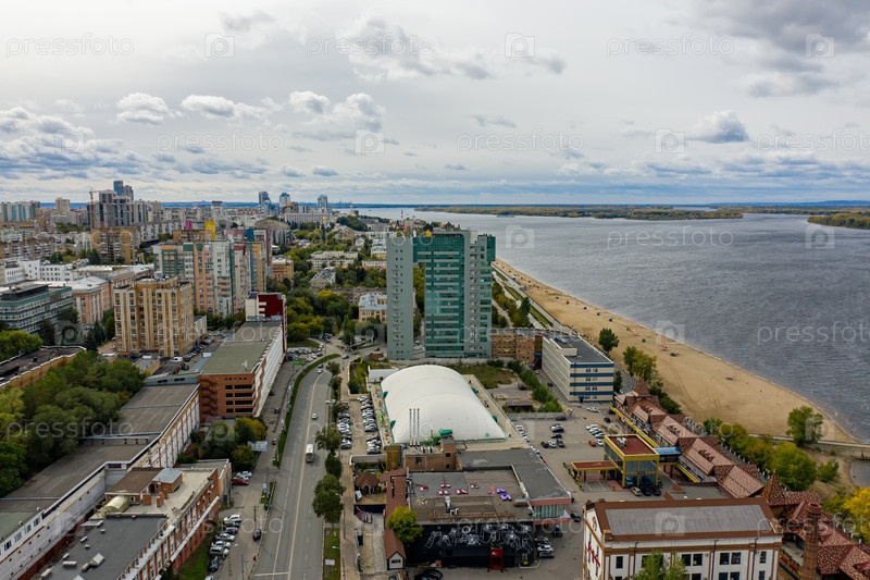 Самара, Россия - 20 сентября 2020 года: офис 'Самаранефтегаза'. Входит в группу «Роснефть». Набережная реки Волги. Вид с воздуха осенью