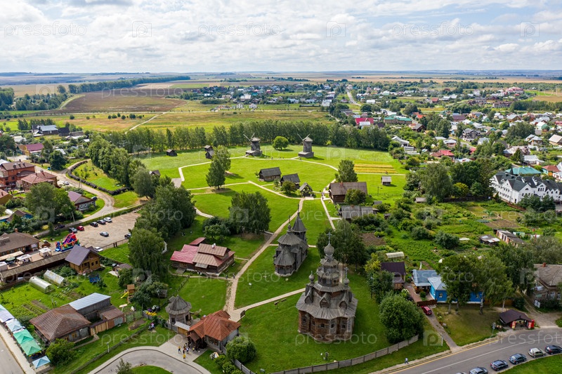 Суздаль, Россия. Церковь Преображения из села Козлятево, перевезенная в Суздаль - памятник деревянной архитектуры середины 18 века. Вид с воздуха