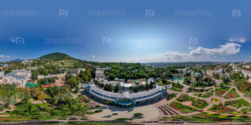 Пятигорск, Россия. Лермонтовская галерея. Парк Цветочный сад. Вид с воздуха. Панорама 360. Лето