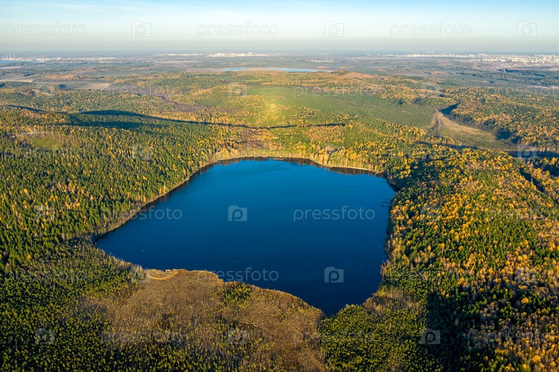Озеро Пескано (Сэнди). Пролетая над осенним смешанным лесом во время заката. Урал, Россия