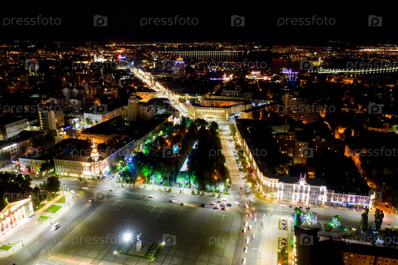 Воронеж, Россия. Площадь Ленина и площадь Кольцовского. Ночная панорама города Воронежа с воздуха. Яркие уличные фонари. Вид с воздуха