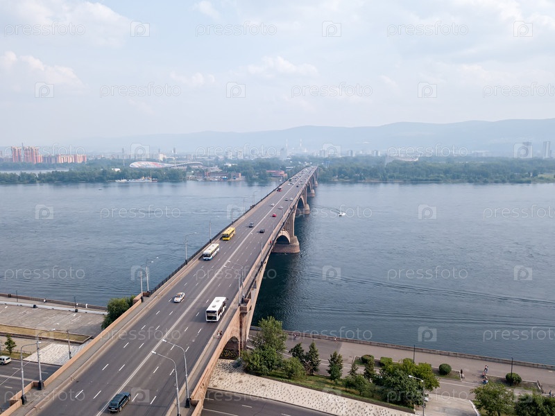Россия, Красноярск. Вид с воздуха на Коммунальный мост через реку Енисей