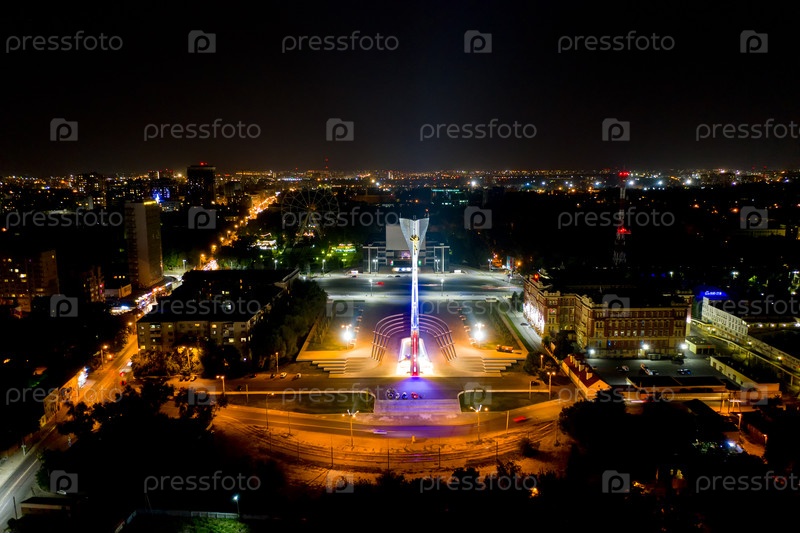 Ростов-на-Дону, Россия - 26 августа 2020 года: Стела освободителям Ростова. Театральная площадь. Ночной вид с воздуха