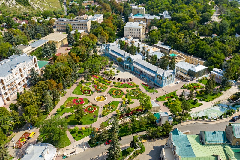 Пятигорск, Россия. Лермонтовская галерея. Парк Цветочный сад. Вид с воздуха. Лето